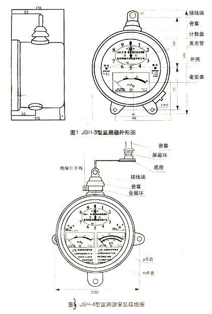 ??JSH-4型監(jiān)測(cè)器配有不銹鋼制作的屏蔽環(huán)及熱縮絕緣的引下線,瓷套外的漏電流通過(guò)監(jiān)測(cè)器瓷套的裙間金屬環(huán),導(dǎo)入內(nèi)中右側(cè)毫安表,毫安表中刻度是用反映污層電導(dǎo)率uS來(lái)表示的,它考慮了我國(guó)主要避雷器生產(chǎn)廠所用瓷套的爬電距離及絕緣子形狀因素。表的上層刻度適用普通瓷裙,下層刻度適用大小防污瓷裙。