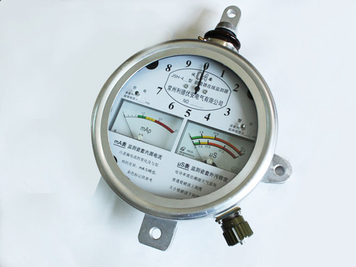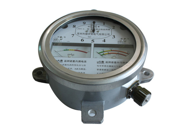 ??JSH-4型監(jiān)測(cè)器配有不銹鋼制作的屏蔽環(huán)及熱縮絕緣的引下線,瓷套外的漏電流通過(guò)監(jiān)測(cè)器瓷套的裙間金屬環(huán),導(dǎo)入內(nèi)中右側(cè)毫安表,毫安表中刻度是用反映污層電導(dǎo)率uS來(lái)表示的,它考慮了我國(guó)主要避雷器生產(chǎn)廠所用瓷套的爬電距離及絕緣子形狀因素。表的上層刻度適用普通瓷裙,下層刻度適用大小防污瓷裙。